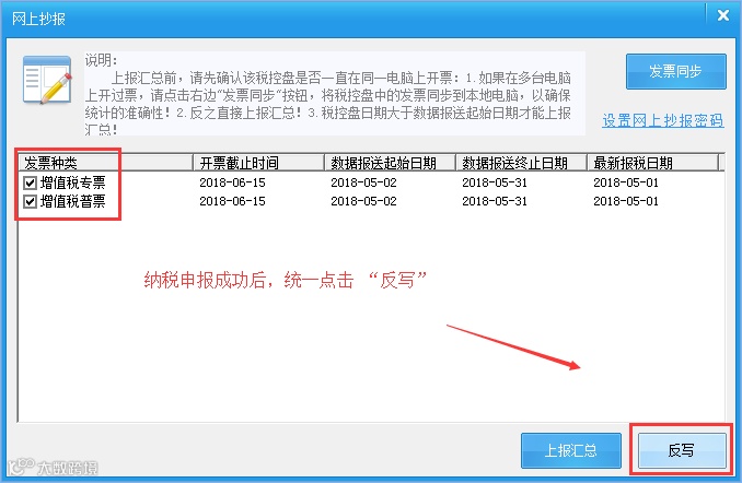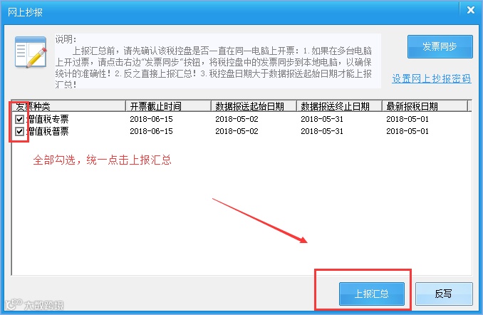 提醒:只要在税控盘中存在的发票类型(主分机结构的也同样适用,所有的税控盘当中的所有票种),都必须在征期的时候勾选【上报汇总】,然后【反写】。