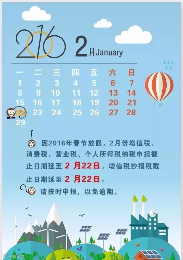 导读:猴年第一个申报期,流转税、企业所得税、个人所得税申报截止2月22日(元宵节),各位童鞋们过完年不要忘
