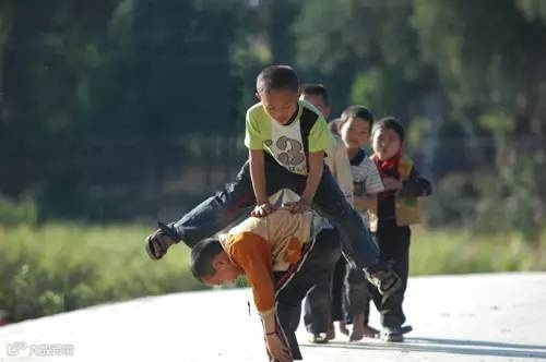 在奥运会体操项目里那叫“跳马”,孩子们叫“跳山羊”,当年普及率极高,几乎全中国的孩子都是高手。一个人当“山羊”,其他人助跑一段后,撑住“山羊”的背或双肩,双腿分开从“山羊”头上越过。“山羊”会越长越高,先是手撑脚背或小腿,然后手撑膝盖,再站直。