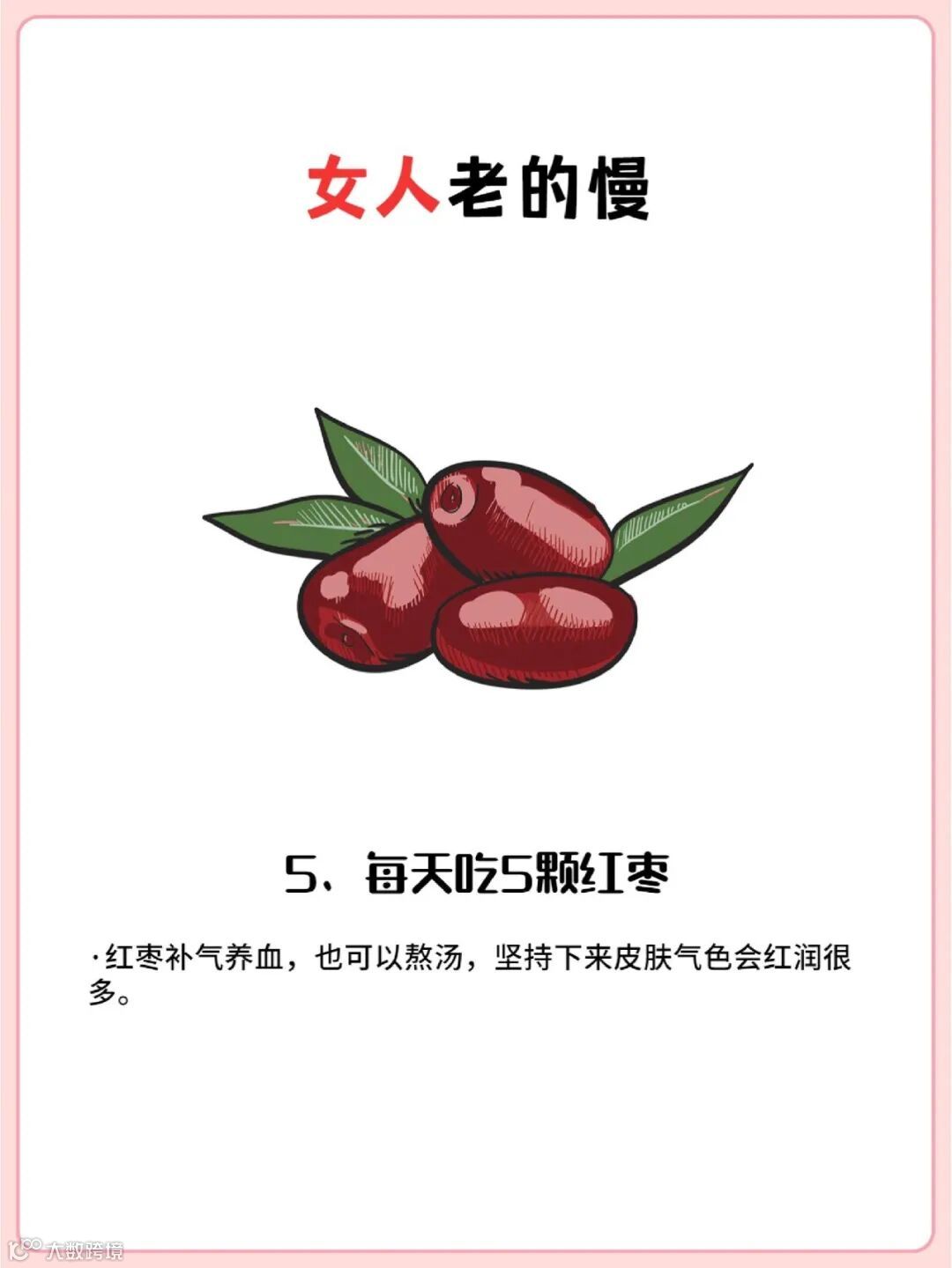 每天吃5颗红枣,可以直接生吃,也可以泡水喝,或者加入汤中熬煮,让你的美丽由内而外绽放!