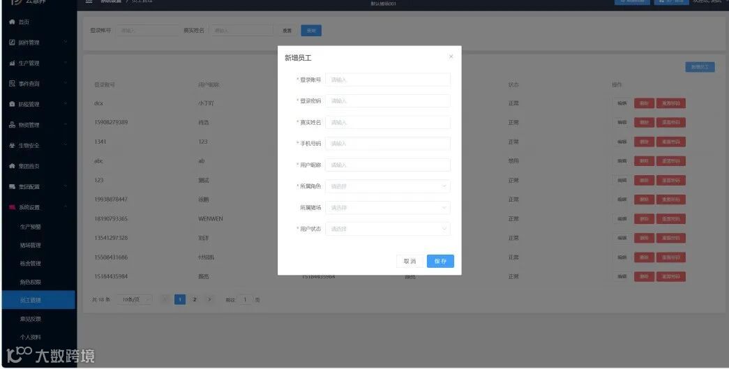 作业日志、员工管理、栋舍管理…