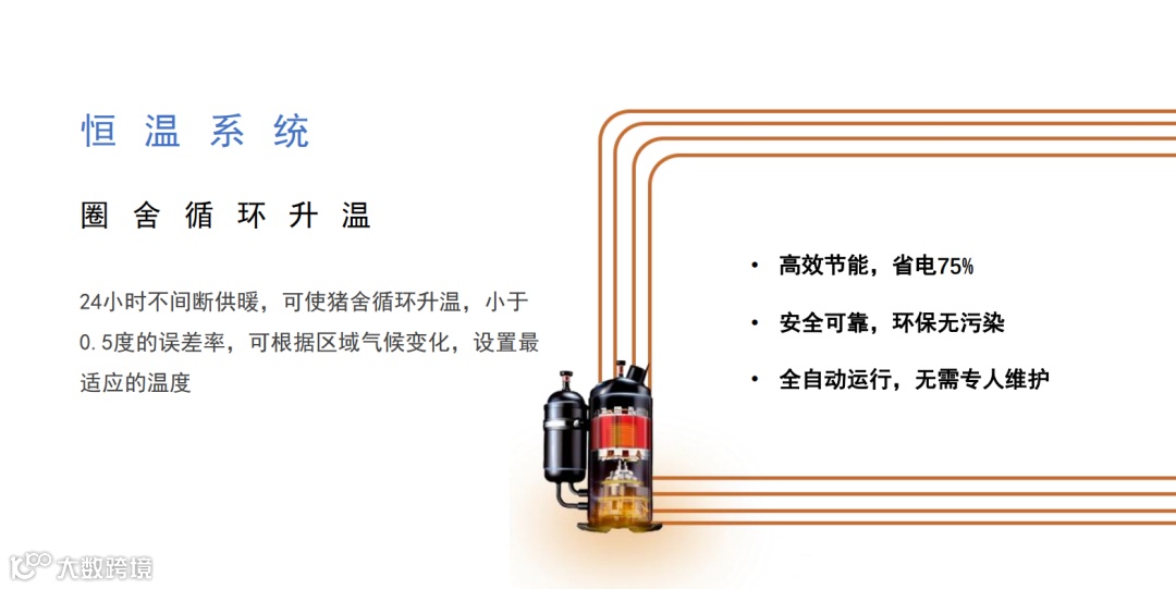 通过技术革新,用空气能采暖系统替代传统养殖场的供暖灯和燃油锅炉。空气能采暖系统更环保,更安全,使用更方便,能快速提升猪场的经济效益。