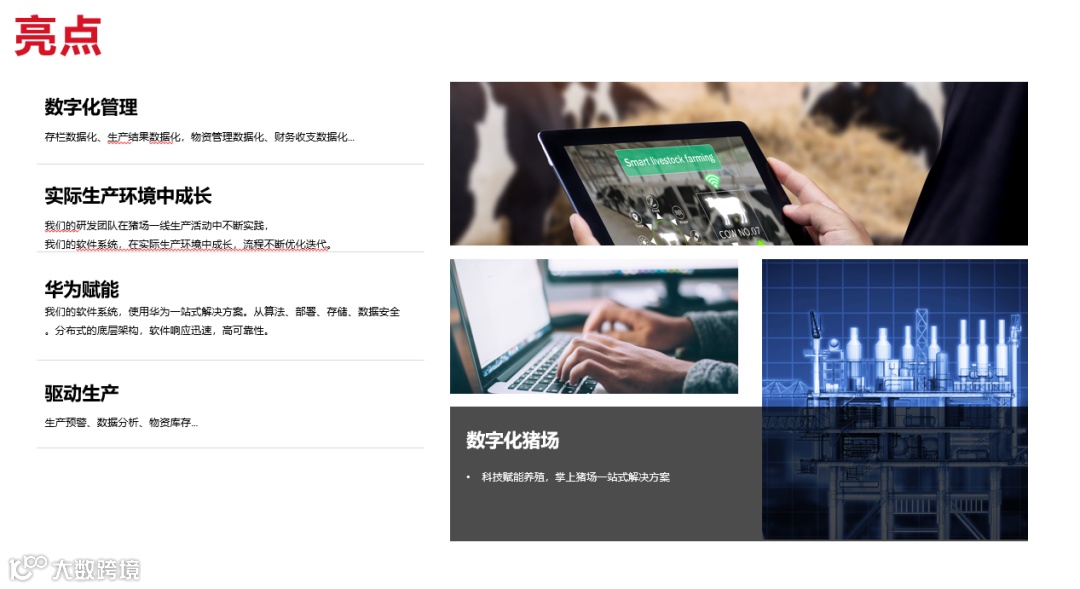 通过科技、智能化新技术改造传统猪场效能低,易出错的工作模式,积极促进猪场产业高端化、智能化。