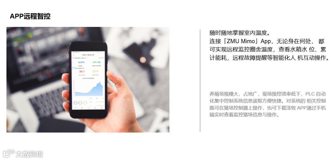过去一个万头的猪场要35~40个人,现在只有5个人了,用机器人管理、称重,一台手机就可以操控数个猪场。