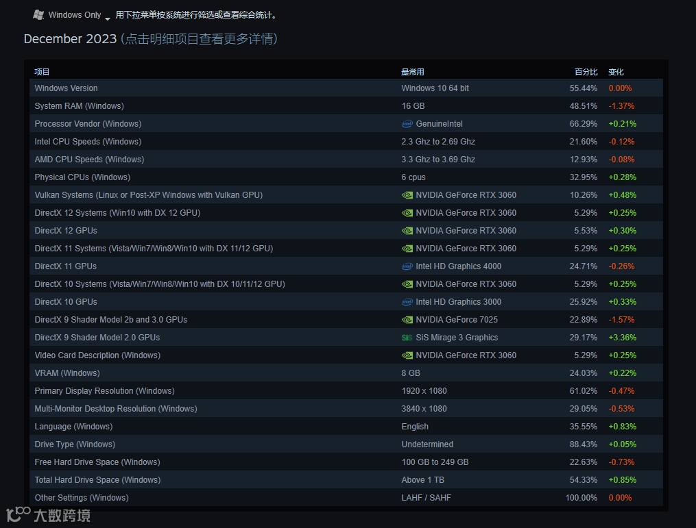 在Steam收集的2023年12月的数据中,可以直观了解到,目前主流PC玩家们正在使用Windows 10操作系统、6核处理器、16GB内存容量、英伟达RTX 3060显卡、屏幕分辨率为1920x1080。