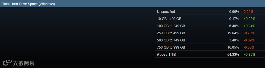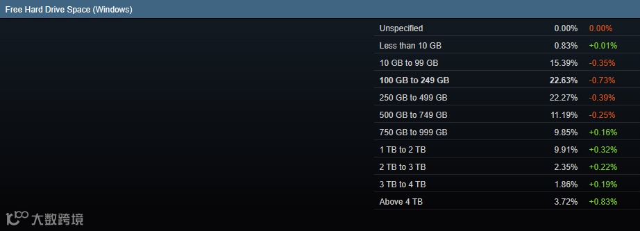 Free Hard Drive Space(空闲硬盘空间)数据中,剩余100-249GB的玩家数量最多,占比达到了22.63%,其次是占比22.27%的250-499GB玩家。在增长比例上,空闲空间在749GB以下的玩家均出现了不同幅度的降低,空闲空间在4TB以上的玩家甚至以0.83%的增长成为了当前占比提升最快的玩家群体。