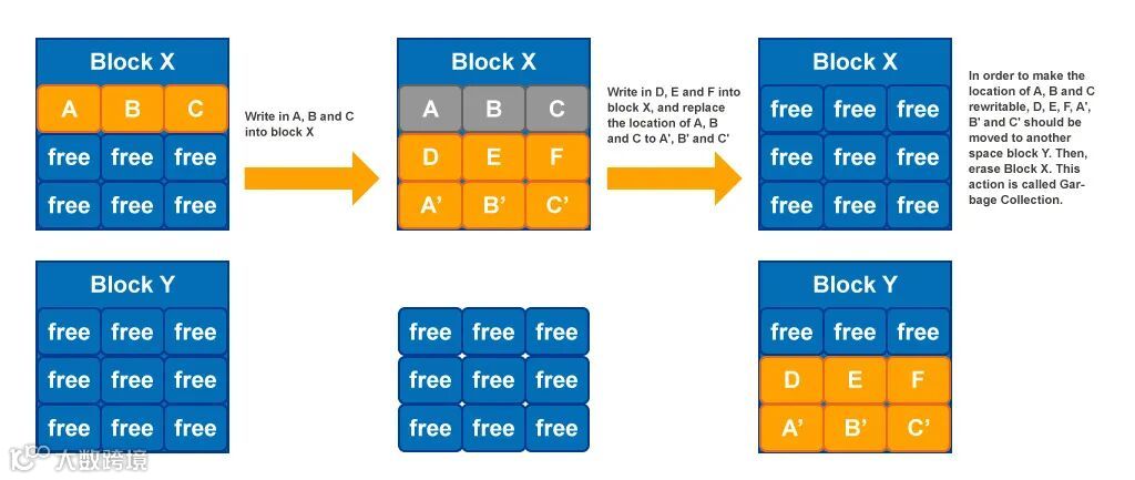 以垃圾回收功能举例,SSD中的垃圾回收(Garbage Collection)是指把现存数据重新转移到其他NAND flash的位置,并将无用的数据彻底擦除的过程。SSD数据的写入以页面为单位,但若要擦除数据则需以区块为单位。因此,要擦除无效的数据,SSD需要把一个区块内有效的数据先复制到全新区块的页面中,这样原来区块中的无效数据才能够以区块为单位进行擦除。区块的数据被完整擦除后即形成一个新的空白区块,后续才能够写入新的数据。