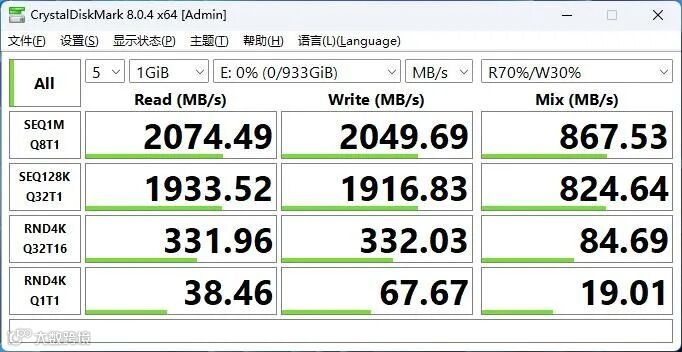 从常用的CDM测试软件中不难看出,连续读取速度和写入速度分别达到了2074MB/s和2049MB/s,基本与官方标称的一致,性能方面是毋庸置疑的。