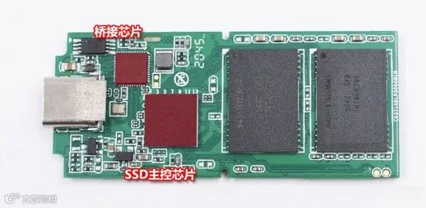 如上图所示,在移动固态硬盘主板上,我们仅能看到一颗主控芯片,而市面上还有很多移动固态硬盘主板上还多了一颗桥接芯片。