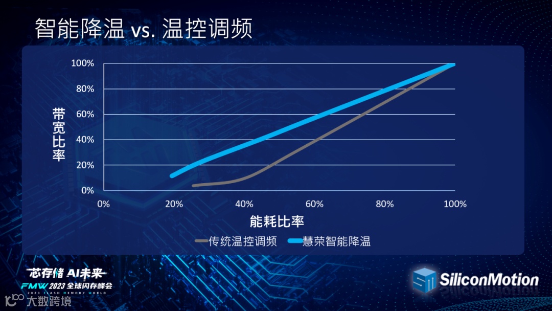 针对温控方面,慧荣科技也采用了更智能的降温调频算法。以往温控方面通过降低主控和闪存颗粒的工作频率,达到分阶段降温与能耗控制,但会导致性能剧烈变化。慧荣科技则重新调整温控算法,让性能与能耗比实现等比调整。