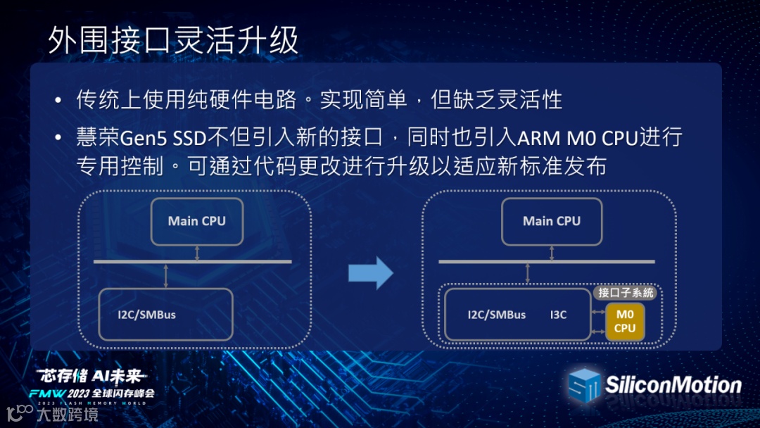 外围接口上,慧荣科技在实现简单但缺乏灵活性的纯硬件电路上进行了升级,不但引入了全新接口,同时也加入了ARM M0 CPU进行专用控制,并且能够通过代码更改进行升级,以匹配不断更新的行业标准。以此来让主机端能够更直接的对SSD实现温度监控、平台强健性/鉴证/恢复以及系统内部纠错等多方位的协作处理。
