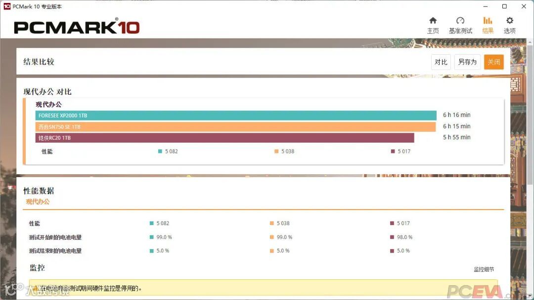 笔记本电脑中,虽然主要耗电在CPU和GPU上,但是PCIe 4.0 SSD的高性能传输同样也对续航时间有一定影响。12代酷睿笔记本开启节能模式时,SSD可以在空闲时进入到最深的PS4睡眠状态,江波龙XP2000 1TB PCIe SSD的在PCMark10的续航测试中达到了6小时16分,性能分5082分。
