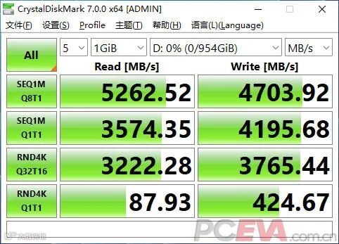 CrystalDiskMark主要是为了检测SSD的理论读写带宽。FORESEE XP2000的实测顺序读写带宽5262.52/4703.92 MB/s。