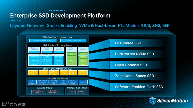 基于全新的「分层固件堆栈」架构,慧荣科技同时也推出了根据定制程度分级的定制方案。为即将迎来落地应用的PCIe 5.0、QLC、ZNS等技术提供全面的、可定制化的企业级SSD开发方案,独特的架构设计也让开发流程更加简化,减少客户在SSD开发中的时间、金钱投入,加快市场应用脚步。