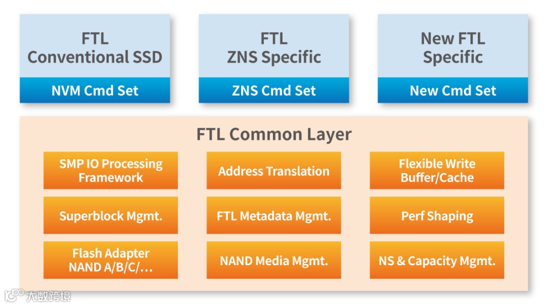 SSD Turnkey应用层(Turnkey SSD Application Layer):这些应用通过可配置的参数和客户应用挂钩,以提供高性能的SSD功能。该层架构包含FTL通用层、特殊的FTL变体(如:NVMe、ZNS及其他),NVMe管理以及设备管理。