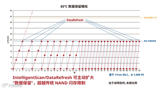 慧荣科技解决方案能够识别高风险记忆单元,并重新整理其中存储的数据。使用此技术(IntelligentScan + DataRefresh)的 Ferri 产品能够将 NAND 闪存阵列的寿命延长到远超过闪存制造商额定的P/E循环寿命。IntelligentScan功能中的智能功能还包括自动响应温度,以及提高在高温下运行时的扫描频率。通过不断扫描存储单元的执行状况,以及重新整理有数据遗失风险的部分,借此防范数据保存故障,以增强存储数据的长期完整性。