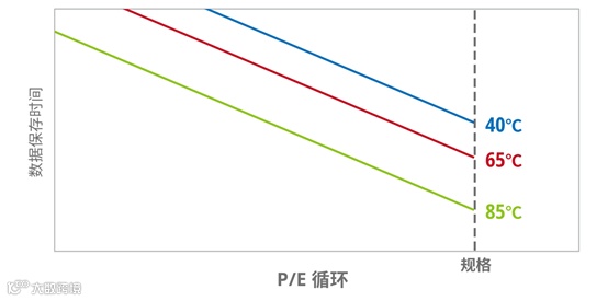 温度一直以来就是各种电子元器件的所要面对的几大重要问题之一,电子设备不仅本自身运行时会产生热量,还会被周边设备热量的传导所影响。NAND Flash存储器在支持编程/擦除(P/E)循环都会略微磨损执行P/E的单元层,随着P/E次数的增加,数据在闪存单元中存储的时间长度会随之减少。在高温环境下NAND Flash存储器寿命缩短速度会加剧,其数据保存能力也会下降的更快。在汽车中控台附近,汽车机械部分运行产生的热量常常会达到85°C,这也就要求中控所使用的存储器能够在严苛的高温环境下稳定运行。
