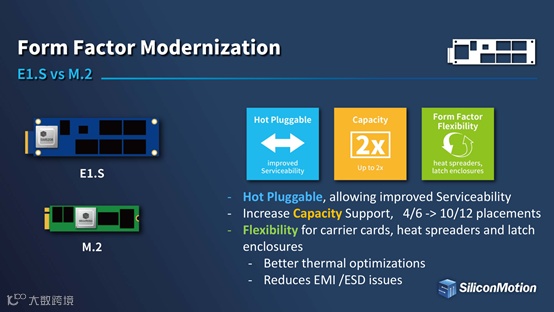 E1.S推出初期被认为是M.2的替代品,相比于M.2,E1.S拥有热插拔功能,支持更大容量,标准外壳下更是让E1.S产品拥有了安装灵活、优良的散热和固定功能,同时也能降低附近电子元器件的干扰和静电。