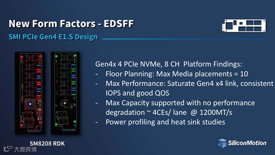 慧荣科技新一代SM8208主控芯片的设计方案,支持EDSFF(E1.S)标准,是一款PCIe Gen4 x4和8个NAND闪存通道,提供出色的性能表现,并且还能提供稳定一致的IOPS和良好的QOS表现。