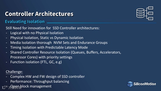 当前的SSD控制器在资源隔离上有很多做法:逻辑但非物理的隔离;物理隔离, 又分静态和动态的隔离;通过NVM set及Endurance Group的介质隔离;通过可预测延迟的时序隔离;共享控制器资源(队列,缓冲,加速器及处理器)的隔离;算法(FTL,GC)隔离。同样也面临着复杂硬件和固件的设计、数据吞吐量平衡和开放式区块管理这些挑战。