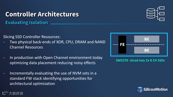 针对以上种种问题,慧荣科技将SM2270 SSD控制芯片进行资源分割之后,可以获得XOR,CPU,DRAM和NAND通道资源的两个物理后端,在如今已量产的Open Channel应用场景中,能够优化数据存放,减少互扰效应。更是能够逐步评估固件堆栈中NVM set的使用情况,从而寻找优化架构的机会。