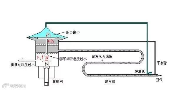 膨胀阀是用在大中型制冷系统中(结构相对较复杂,可调节),对制冷剂流量的调节除了可以控制蒸发器外,还可以用来调节冷凝器。当蒸发工况允许的情况下,若冷凝压力过高,可以适当关闭膨胀阀,减少系统中制冷剂的流量,降低冷凝器负荷,从而降低冷凝压力,实现空气能热水器机组的高效 和可靠运行。