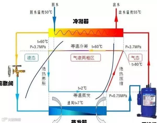 空气源热泵和空调的制冷系统原理相同,都是采用“逆卡诺循环”原理,以压缩机为动力,制冷剂为载体,依次经过等温蒸发、绝热压缩、等温冷凝、绝热膨胀,四个不断循环过程,将热量在空气和水之间转移。