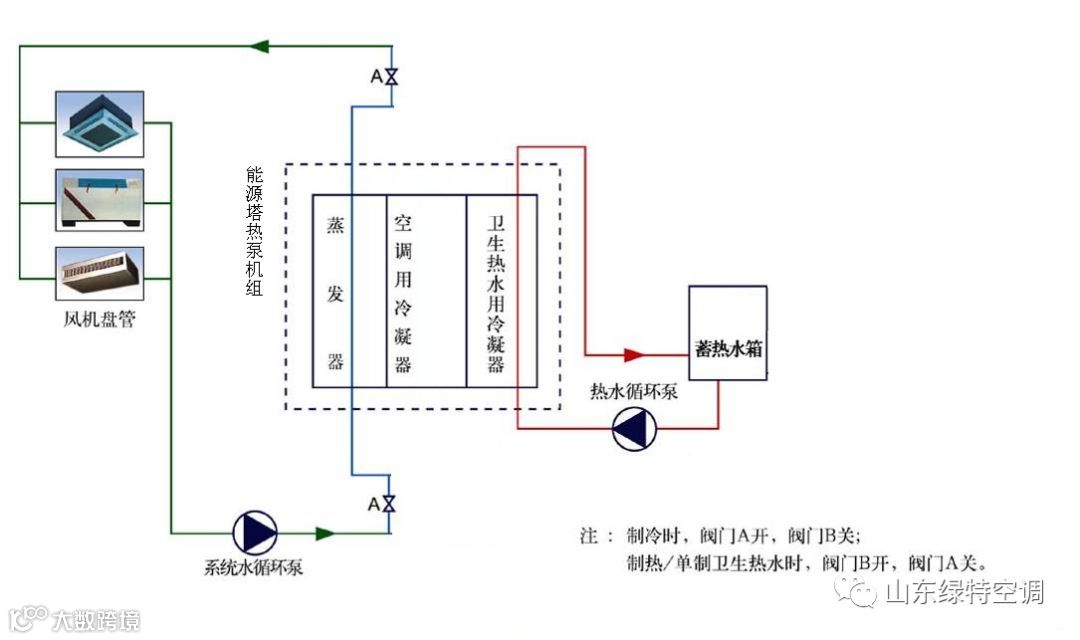 取代原来水冷系统+燃油/燃气/燃煤锅炉,节省占地面积。能源塔热泵系统不仅可以夏季制冷、冬季供暖,而且机组还可以提供一年四季生活热水,特别是夏季机组可以做热回收将室内热量收集起来转移到生活热水中,相当于夏季免费制取生活热水。
