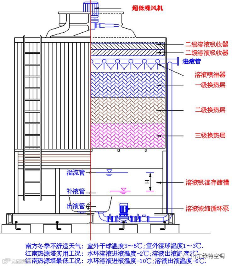 能源塔是利用水和空气的接触,冬季制热是按照供热负荷能力设计的换热面积,利用冰点低于零度的载体介质,高效提取低温环境下的相对湿度较高的空气中的低品位热能,通过向能源塔热泵机组输入少量高品位能源,实现低温环境下低品位热能向高品位转移,对建筑物进行供热以及提供热水。夏季制冷,通过蒸发作用来散去空调中产生的废热的一种设备。
