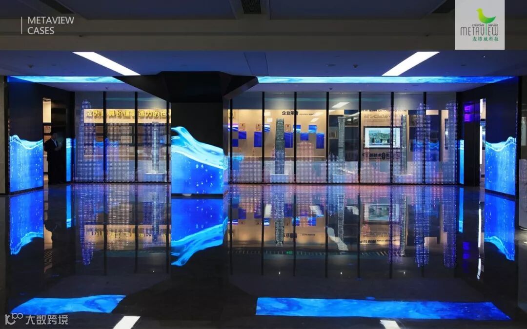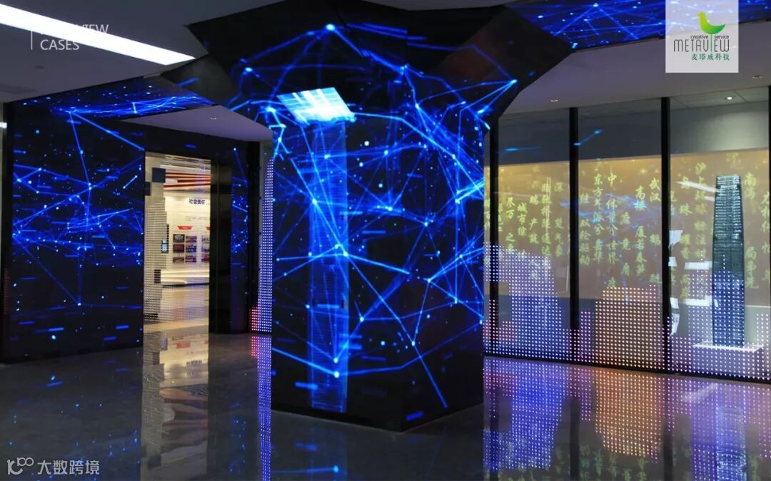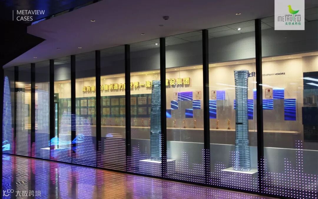 最内层的通电玻璃,通电时是透明的,可一览展厅大局,不通电时可投影出定制的数字内容和文字,切换自如。