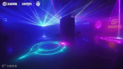 这是一个全新的实验性创作,由数百条相互交叉的令人眼花缭乱的移动光线创造出无尽的光波场域,结合王者荣耀及王者荣耀高校联赛相关元素表达,打造光影沉浸式舞台和光路通道,营造出奇幻的空间感以及强烈的电竞氛围感。
