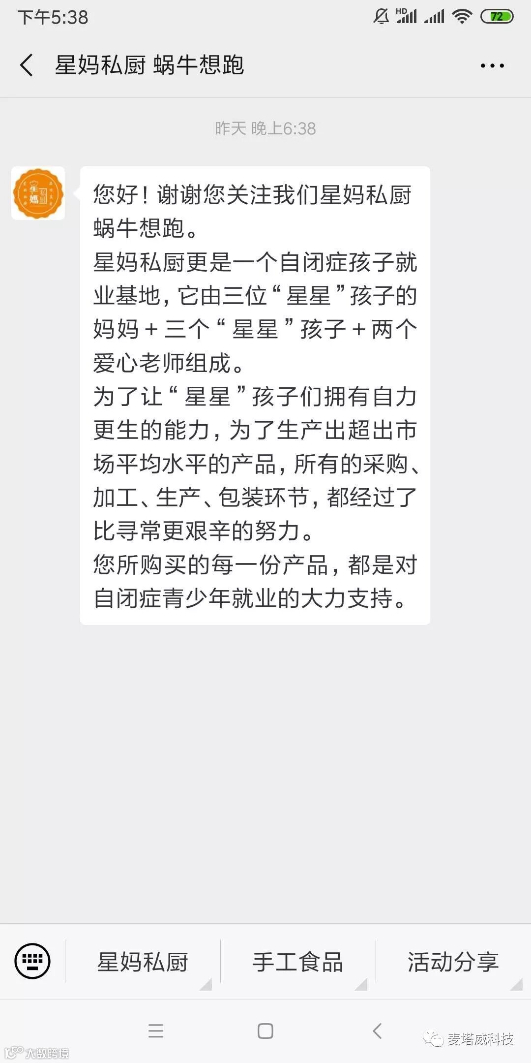 麦塔威的小伙伴,在了解孩子们的情况后,也关心起小店的未来,如何为小店宣传,让蜗牛“快跑”起来。老师向我们展示最新建立的微信公众号“星妈私厨 蜗牛慢跑”,以后又多了一个订购“星星”美食和分享“星星”故事的渠道。