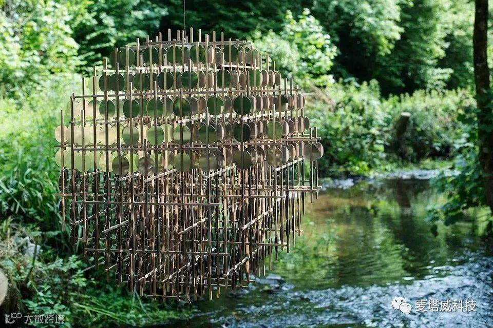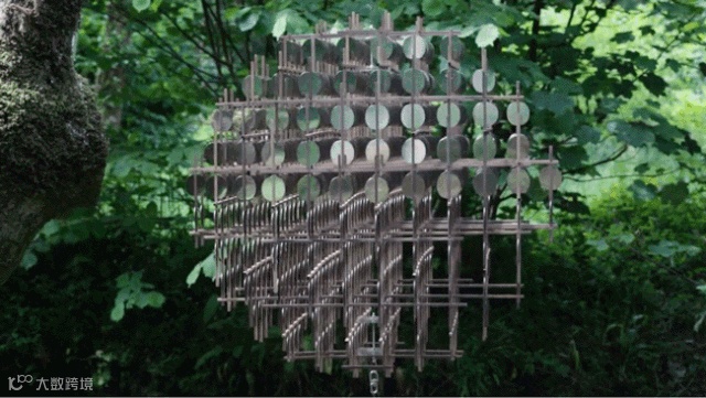 该作品由数百个不锈钢硬币形状的零件,穿插在胡桃木框架内组成。光线通过装置反射形成巨大的发光体,引发了混乱的数字化效果。
