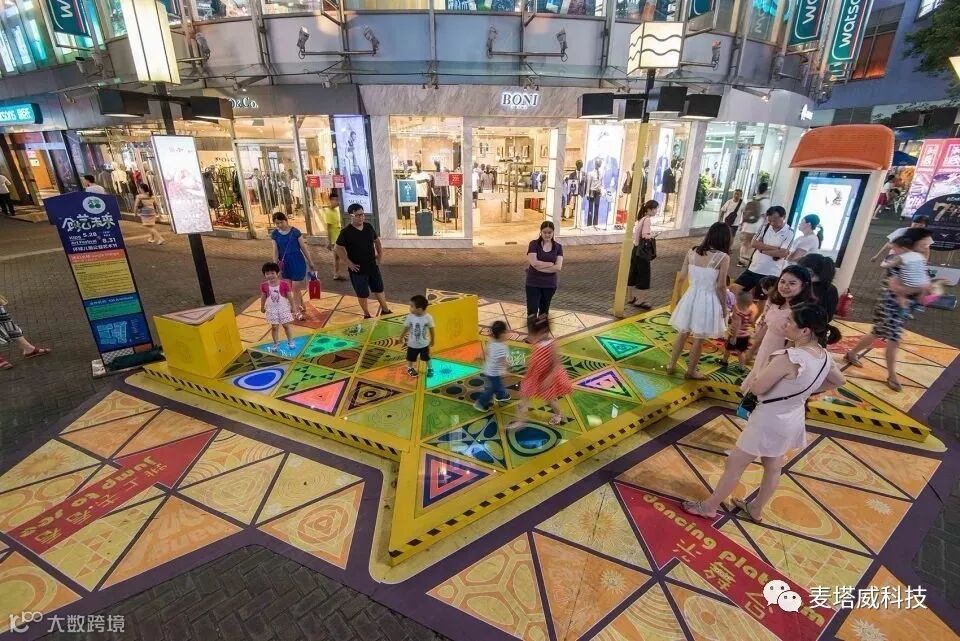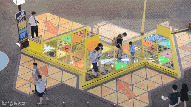 在新一代舞蹈游戏的基础上,设计师创造了一个灯光和音乐的反应平台,当人们踏到三角板上时,灯光和音乐会做出相应的反应。