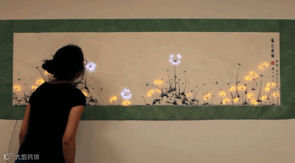 内嵌LED电路的水墨画作品《蒲公英》,除了自带的蒲公英变色功能,观赏者只要贴近画面吹动蒲公英,就能体验蒲公英种子“噗”的一下,随风散去的感觉。