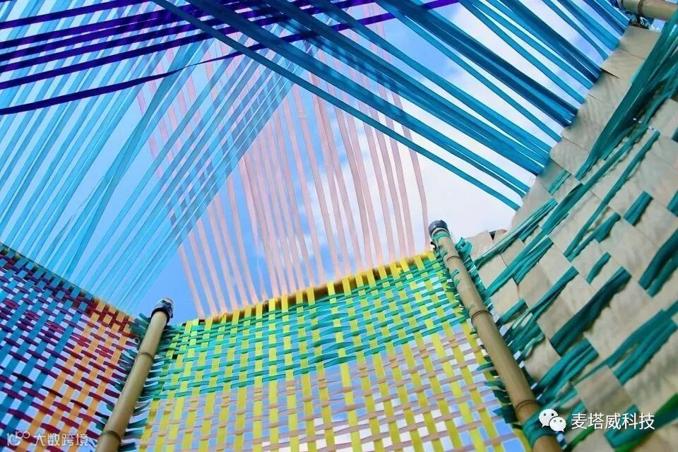 结构搭建完成后,阳光板和麻绳给了孩子们更完全的创作自由。麻绳发展出了无数种缠绕方法,带来了极为丰富的空间围合度;阳光板上的彩色拼贴让剪刀成为了孩子们的画笔,利落的剪刀径直剪向或完整或细碎的色彩,色块交迭后愈加丰富的色彩成为了阳光下颜色的游戏。