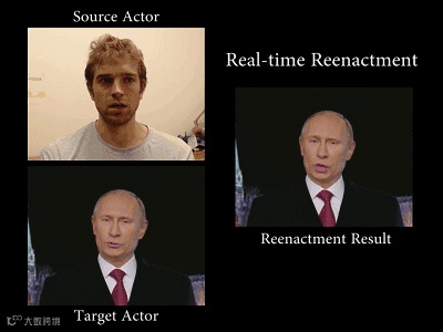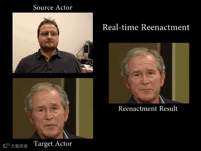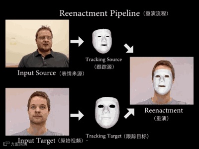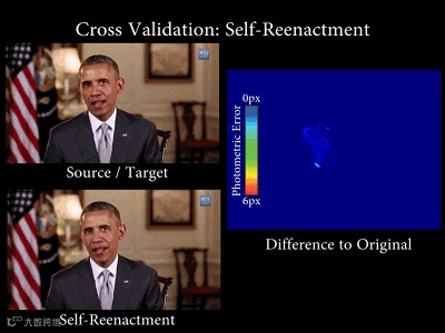 ▲ 这个软件的根本原理是使用一种密集光度一致性方法(dense photometric consistency measure)来实时跟踪源和目标视频中的面部表情。只需将其与一个现成的摄像头、一个人脸跟踪软件,以及预先准备好的他们希望模仿人物的视频结合在一起,该软件就能够随时变形这个原始视频。我们是通过一个活生生的表演者来驱动目标视频中人物的表情,然后通过对其重新渲染以一种非常逼真的效果输出操纵后的视频。还是那句话 “以后再开视频,你懂的!”