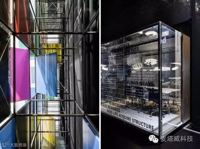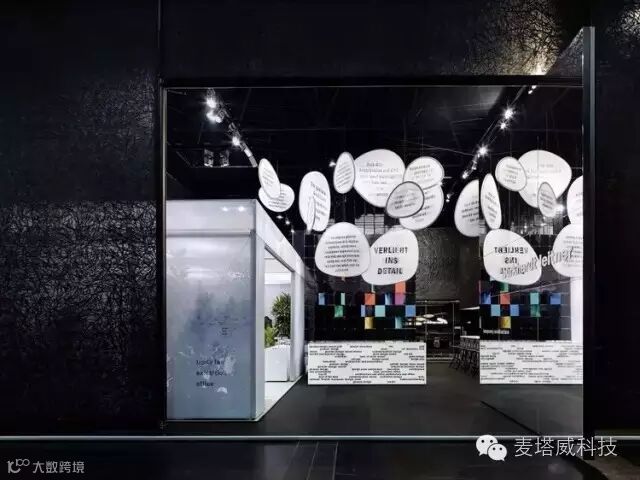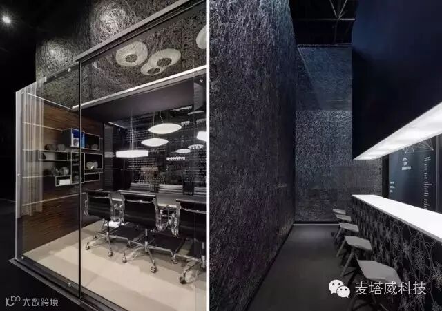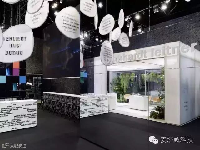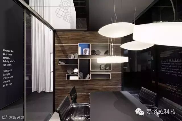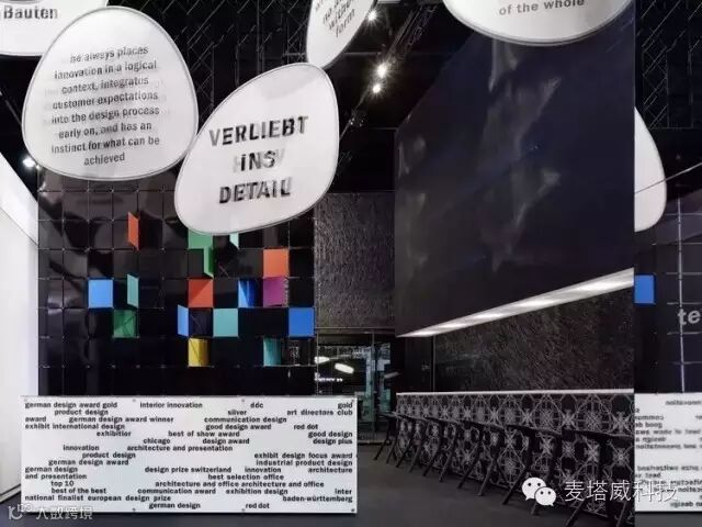 展览展示馆镜面墙壁与入口呈直角,标识出主入口。镜子的背面上是抽象的图形,描述的是公司在全球范围内的分点。游客们从这里可以到服务台,正面的印刷玻璃展示了Bukhardt Leitner产品获得的众多设计奖项。