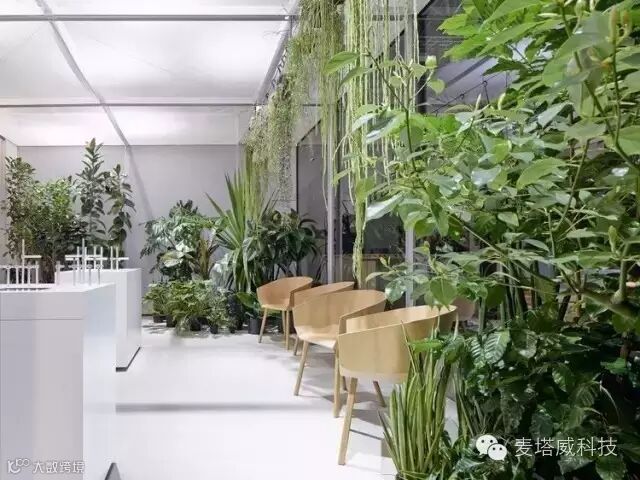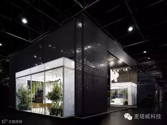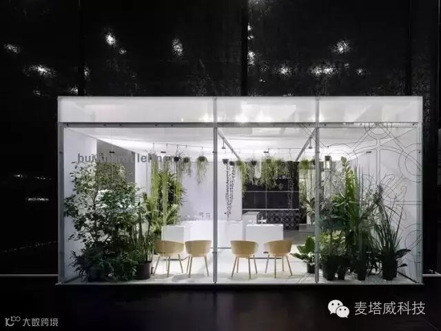 立方体体量突破展览展示馆外墙,宛若悬浮的玻璃温室。室内种植着热带森林植被,进一步加强了玻璃温室的印象。从外面看去,茂盛的植被在热闹的商品展销会形成一片宁静的绿洲。棕榈树叶下面散放的椅子吸引着游客们来休憩片刻,翻阅最新的出版物。