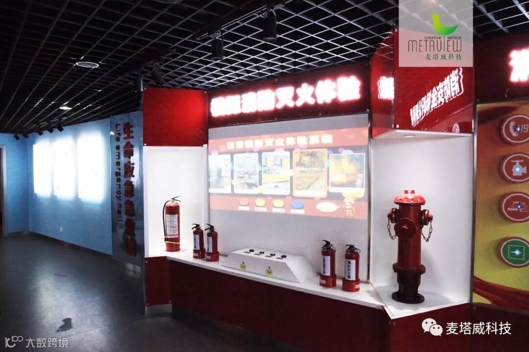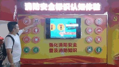 大屏幕展示不同的着火场景,体验者需要选择合适的灭火器,对准屏幕“火源”灭火,灭火成功,还要闯关消防知识问答。