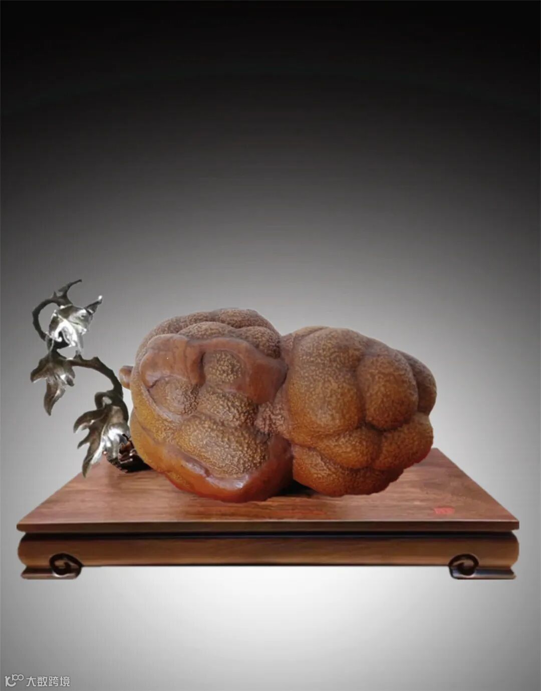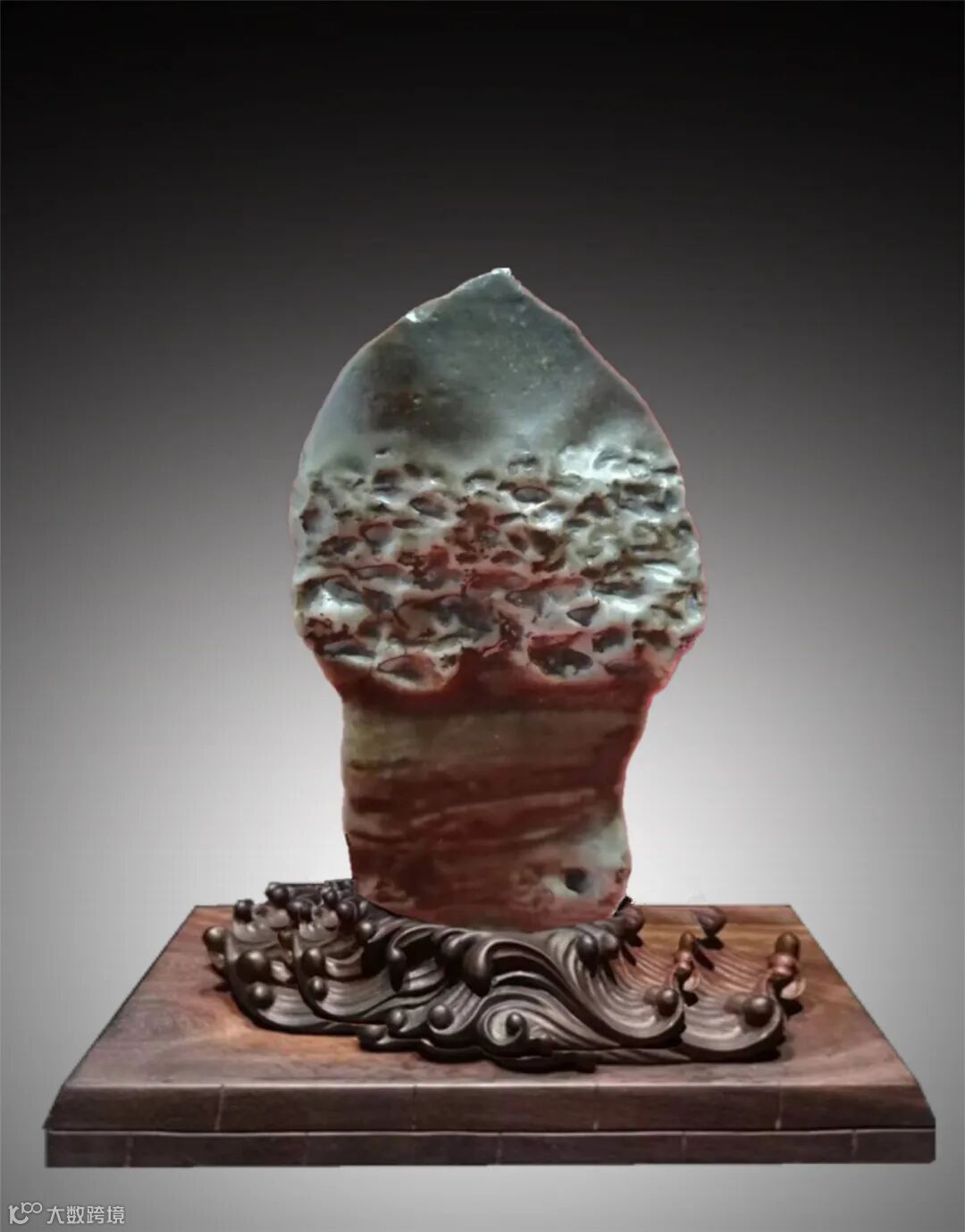 翻转至背面,造型如同一只绵羊之首,纹理独特,石头表面卷纹、沟壑、形态自然天成,极似羊头蓬松的卷毛。那凸起的羊嘴、传神的羊眼和卷起的羊角,恰到好处地呈现出了绵羊的面部特征,显得生动逼真,仿佛一只真实的动物站在面前,栩栩如生。《说文解字》阐释“羊大为美”“羊,祥也”,羊作为吉祥的象征形,赋予藏品诸事顺遂、祥和美好、兴旺发达之意。