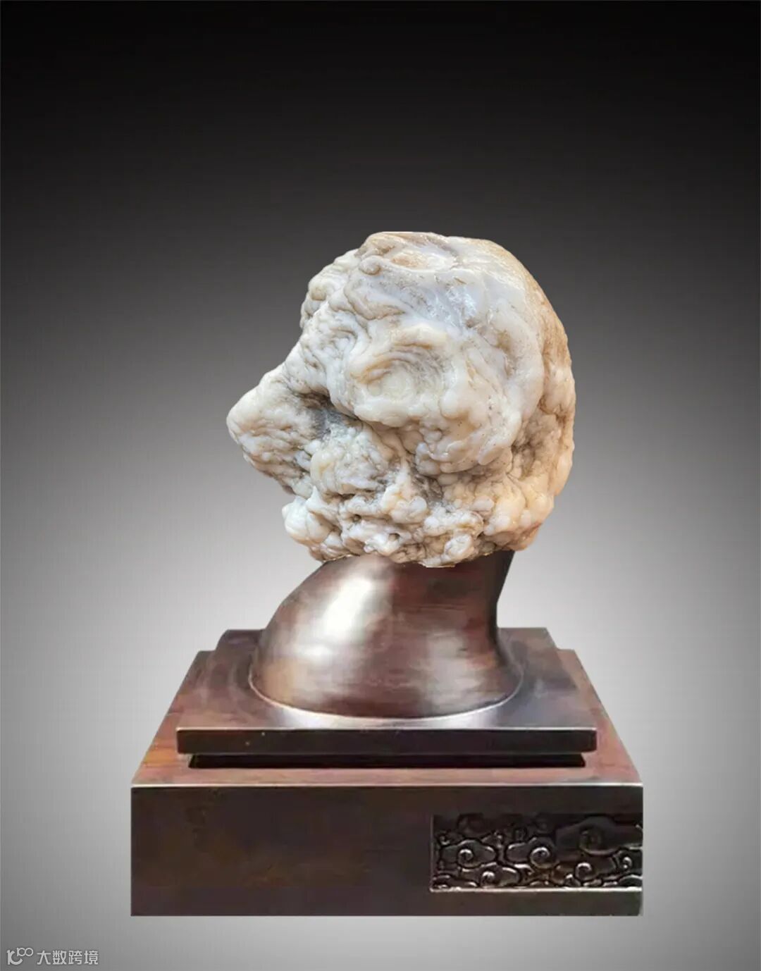 藏品正面为老者侧脸头像,五官俱全,轮廓清晰,比例协调,玛瑙质地的石肤极其油润,层层密布的罗汉纹如同时间的刻痕,构成了一位饱经沧桑、智慧超群的老者面容。那起伏的褶皱,那高耸的鼻子、深邃的眼窝、干瘪的嘴巴,卷曲的胡须……每一处细节都那么奇巧精绝,宛如一尊充满艺术感的艺术雕塑呈现在眼前。其独特的形态和神韵,展现了生命的厚重与岁月的沉淀。