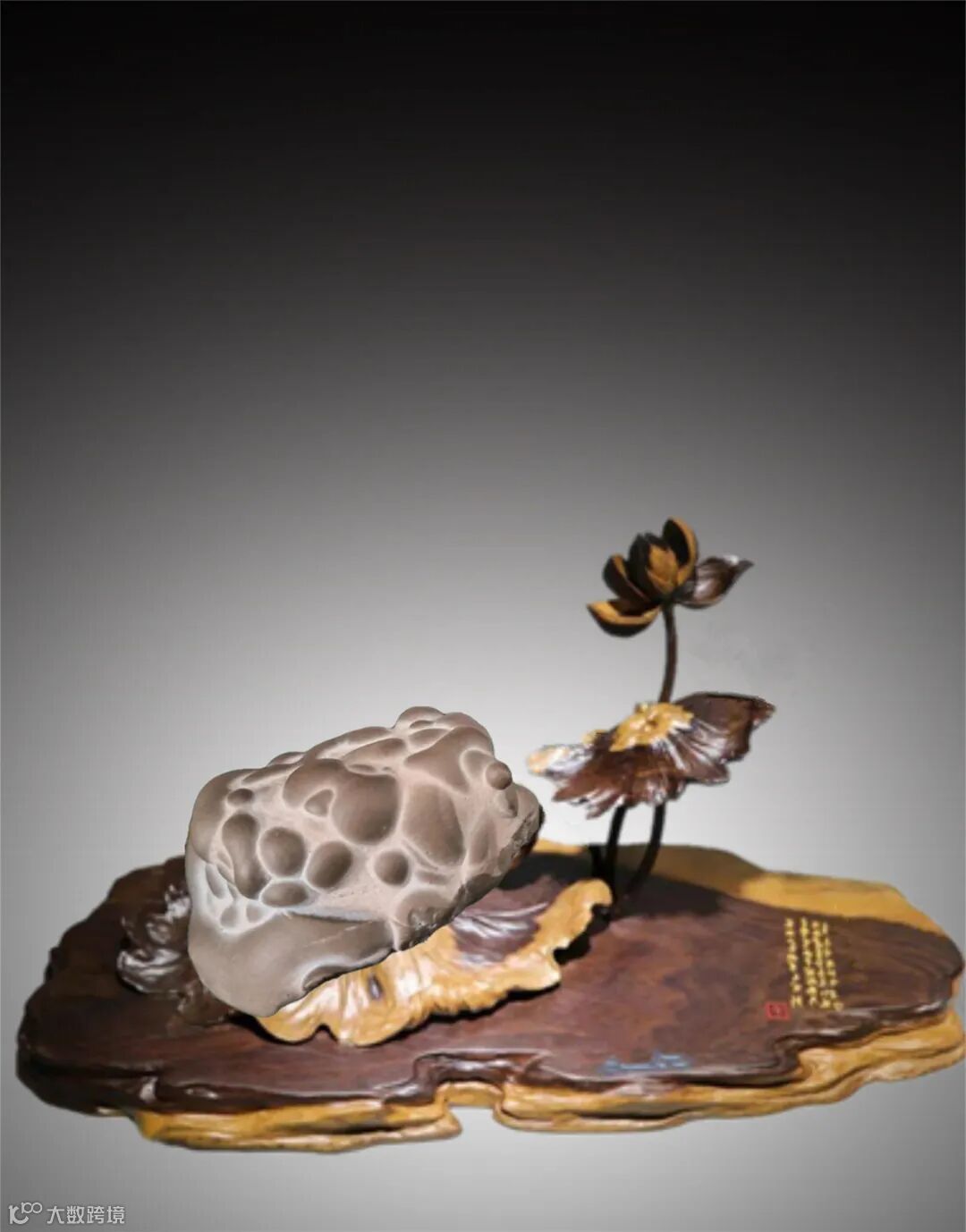 此方陈炉石形态立体,纹理奇特,色泽古旧,韵味悠长,其最传神之处在于天然象形,宛若踞坐蹲伏的蟾蜍,栩栩如生。