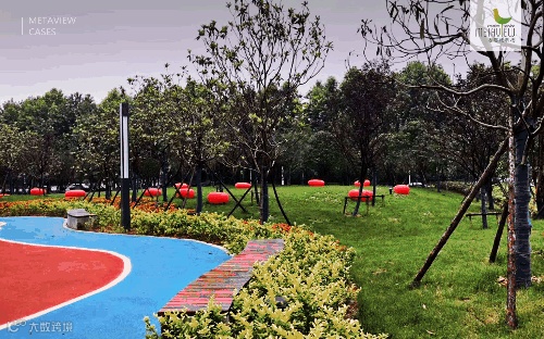 大量的血红细胞座椅置于公园草地,将运动健身、休闲旅游与自然山水巧妙融合。夜晚来临,每个红细胞底部光芒四射,象征着顽强的生命力,人与自然和谐共生。