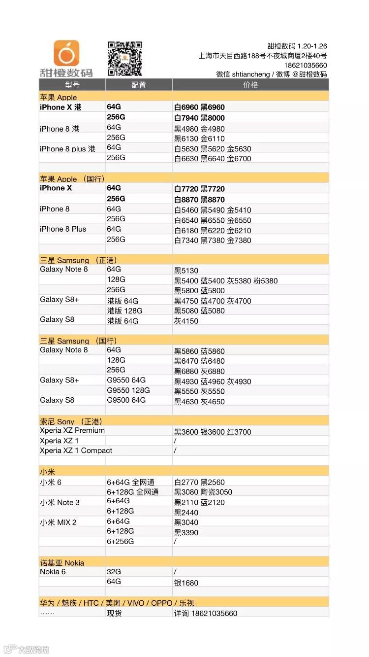 iPhone X 价格继续下行,港版 iPhone 8 及 plus 走低 50 元;三星 Galaxy S8/S8+ 国行版小降,港版降幅较大,Note 8 小幅走低;索尼 Xperia XZ Premium 小降 20 元;小米 6 价格稳中有降,小米 Note 3 价格坚挺。