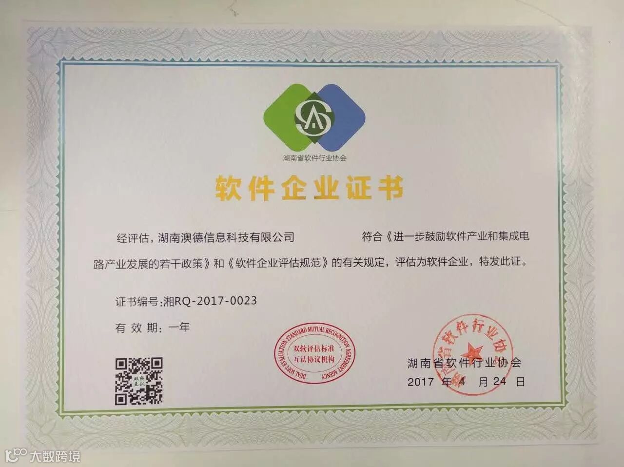 2017年4月24日,经湖南省软件行业协会认定,湖南澳德信息科技有限公司被评为“双软企业”,获得了《软件企业证书》和《软件产品证书》。