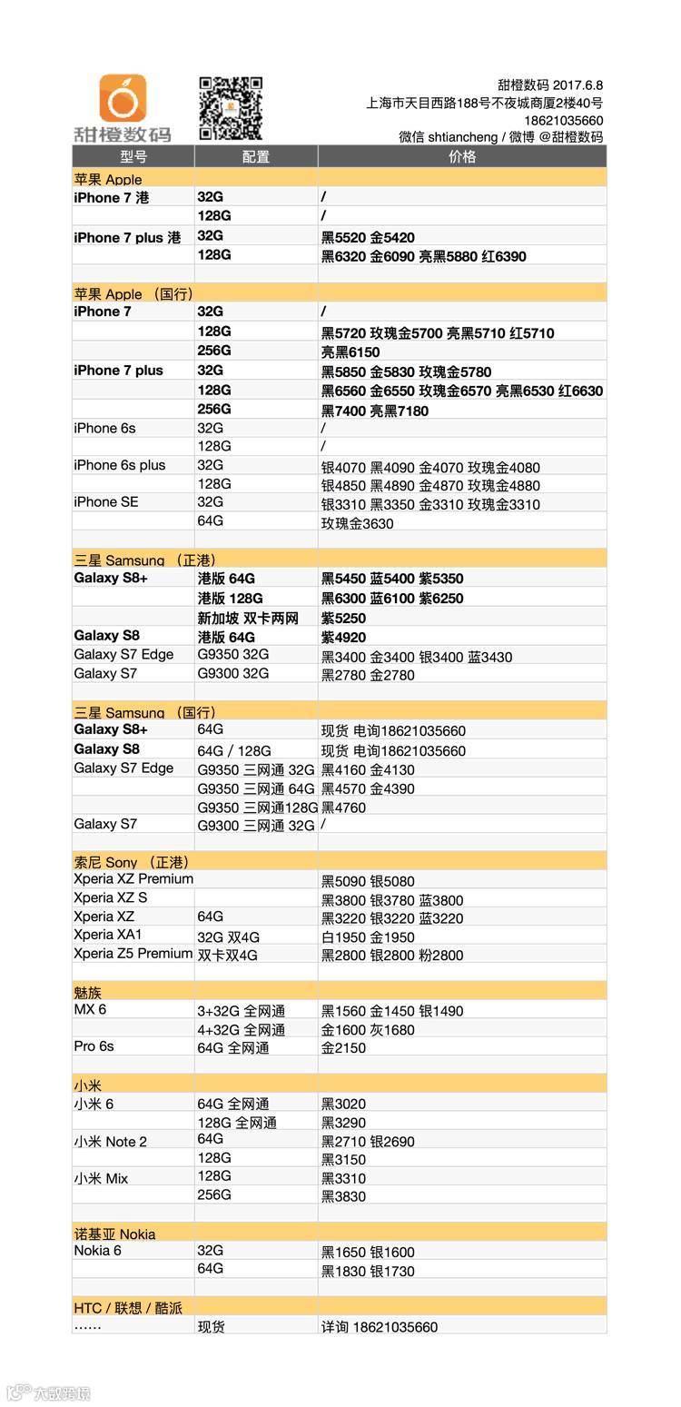 iPhone 7 plus 128G 港版机型小幅走低 10 元,国行版各款 iPhone 目前稳定;三星 Galaxy S8 价格稳定,S8+ 之前因需求旺盛价格飙高,目前已稳步回落;索尼新款旗舰机型价格稳定。
