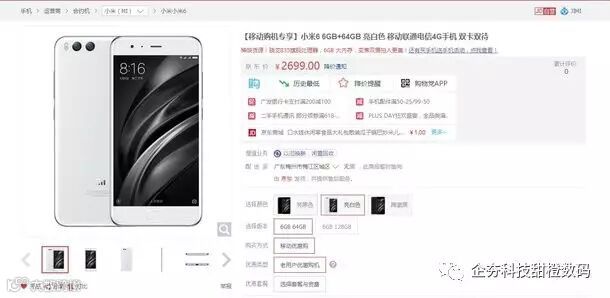 不过,没有亮白色的问题近日得到了解决,目前在电商平台京东已经上架了亮白色版本的小米6,但值得注意的是亮白色小米6属于移动合约机,版本也只有6GB+64GB可选,售价2699元,比标注版裸机要贵200元。