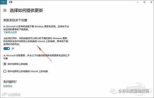 关闭方法:点击开始菜单→“设置”→“更新和安全”→“Windows更新”→“高级选项”→“选择如何提供更新”,将“当此项打开时,你的电脑还可以将以前下载的部分Windows更新和应用发送到本地网络上的电脑或Internet上的电脑,具体视下面选择的内容而定”前面的复选框去掉即可;