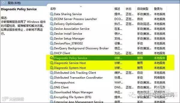 关闭方法:点击Cortana搜索框输入“服务”,点击服务列表输入“Diag”,将搜索出来的三个以“Diag”开头的服务全部禁用(Diagnostic Policy Service、Diagnostic Service Host、Diagnostic System Home)即可;
